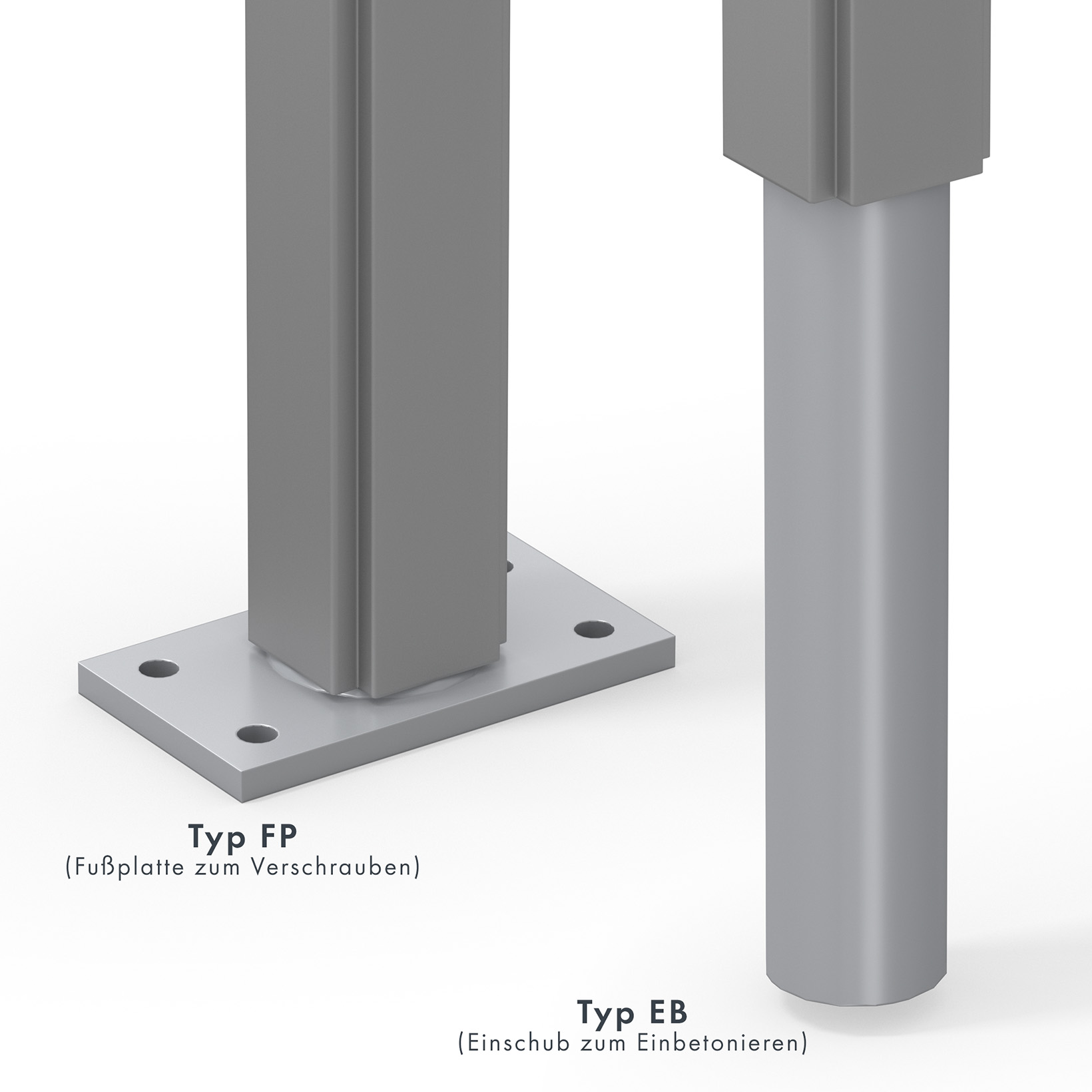 - Standbeine: mit Standbeinen zum Einbetonieren, mit Standbeinen zum Aufdübeln